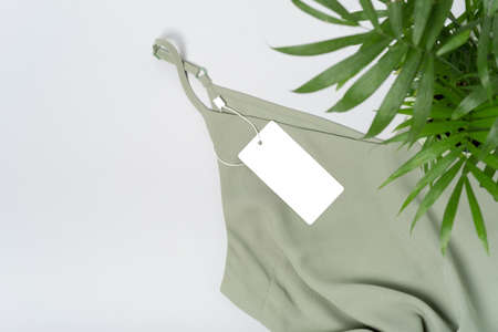 Blank tag or label with green textile clothes. Eco concept.