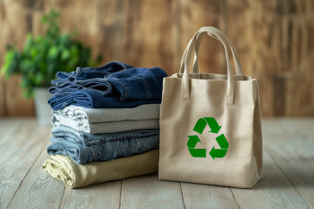 Sustainable fashion: folded clothes with recycle symbol on eco-friendly tote bag.