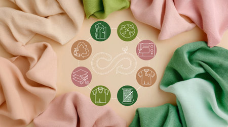 Cotton fabrics and sustainability icons on beige surface. Flat lay illustrates circular fashion practices like reuse and responsible consumption. Ecological infographic.