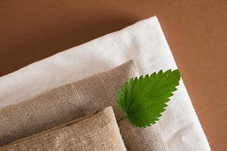 fresh nettle leaf and natural fabrics on a brown background, natural nettle fabrics, fashionable eco-friendly materials, modern and traditional technologies