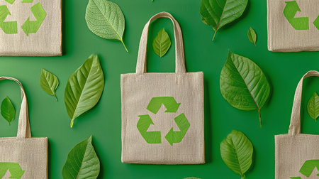 Natural fabric tote bags featuring a recycling symbol sit on a vibrant green background, accompanied by various green leaves to emphasize an eco-conscious lifestyle.