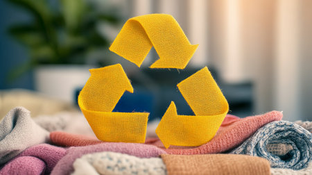 Vibrant recycling symbol crafted from yellow yarn, surrounded by eco-friendly textiles and accessories, showcasing sustainable fashion and a commitment to the environment.