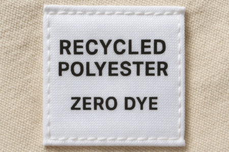 Close up of a clothing label indicating recycled polyester and zero dye, highlighting sustainable and eco friendly textile practices