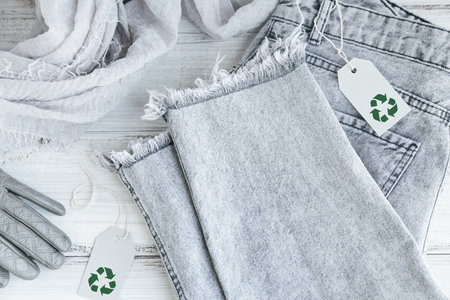 Gray jeans and paper tag with Recycling symbol on white background