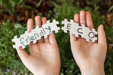 The words ECO FRIENDLY on a green background. The concept of biophilia and ecology. top view. copyspace.