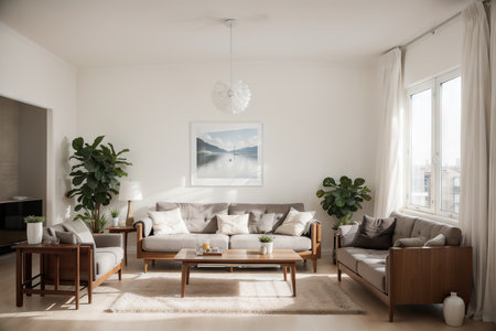 A D-rendered Scandinavian-style living room interior showcasing minimalist design elements, neutral color palettes, sleek furniture, natural textures, and harmonious lighting for a modern, cozy