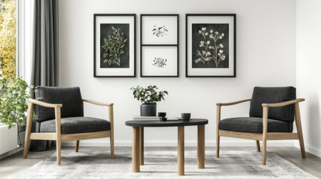 Living room decor, home interior design . Scandinavian Minimalist style with Wall Art decorated with Wood and Metal material . Generative AI AIG26.