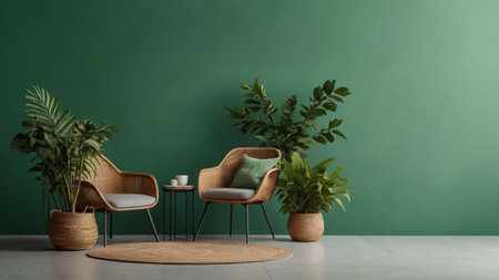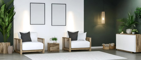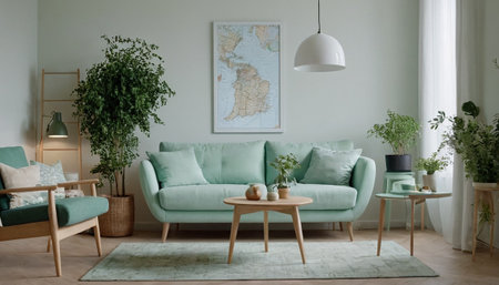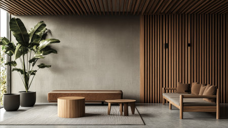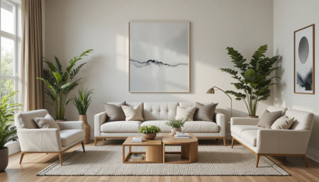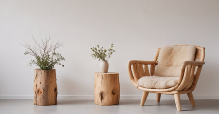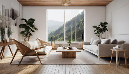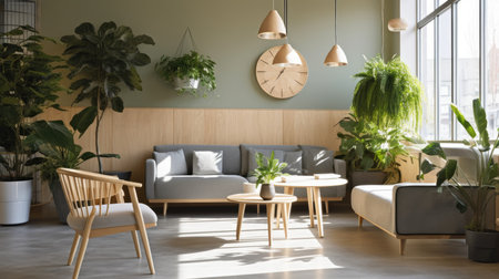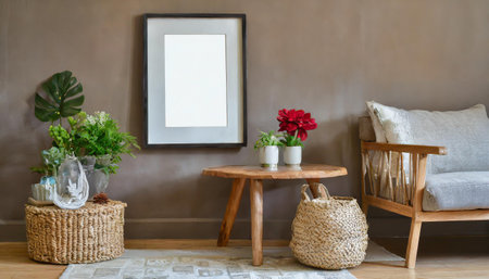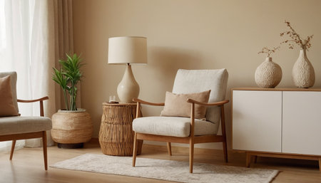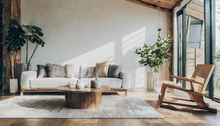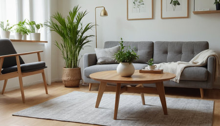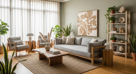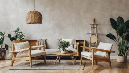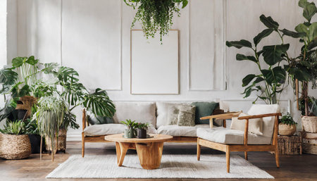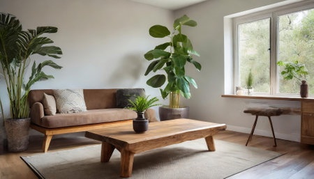 Natural living room interior with green plants and wooden furniture for warm home decor