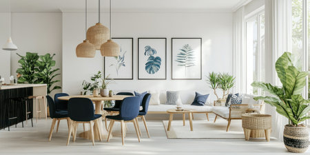 Contemporary living and dining space featuring botanical wall art, indoor plants, and stylish furniture with natural lighting.