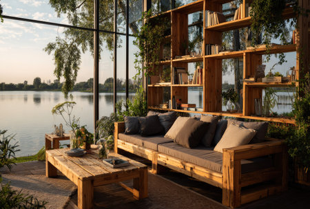 The image showcases an interior space with wooden furniture, including a sofa and a coffee table. The scene is enhanced by a large window overlooking a lake. The composition includes a wooden shelving unit and greenery. This setting could be suitable for lifestyle content or interior design projects. The warm lighting and natural elements suggest a peaceful ambiance.