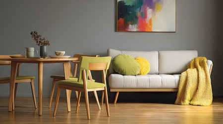 Modern dining area with a wooden table and chairs, featuring a comfortable light beige sofa with decorative green and yellow cushions and a blanket. The wall is a neutral gray, with an abstract painting hanging above the sofa. The floor is light wooden.