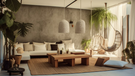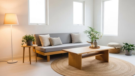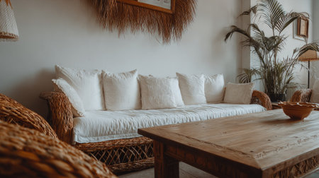 A spacious living room displays a comfortable woven sofa with white cushions, a wooden table, and decorative plants. The scene features warm colors, soft textures, and natural lighting. This image is suitable for illustrating home decor, interior design, or lifestyle content, and other commercial applications.