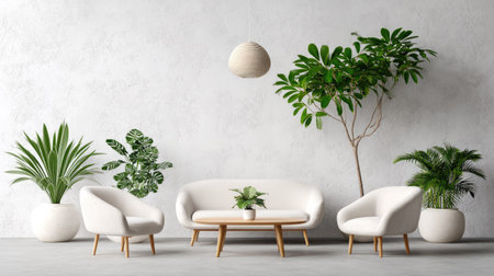 This image showcases a modern interior design with a focus on natural elements. It features a seating area with a white sofa and chairs, accompanied by various potted plants. The setting displays neutral tones with a textured wall and overhead lighting, creating a calm atmosphere suitable for various visual projects.