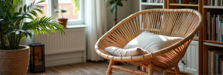 Cozy sunlit room with rattan chair and greenery by bookshelf. That the image is generated using AI.