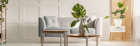 Modern living room interior with comfortable sofa, coffee table and decorative plants