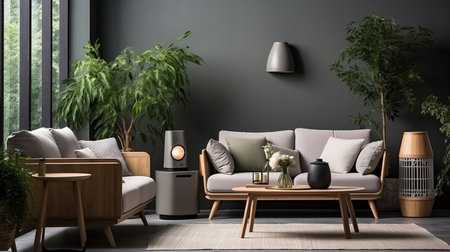 An air purifier in a living room for improving the quality of indoor air. It can help to reduce the risk of respiratory problems, such as asthma and allergies. AI Generated.