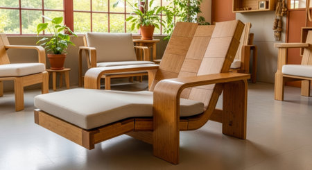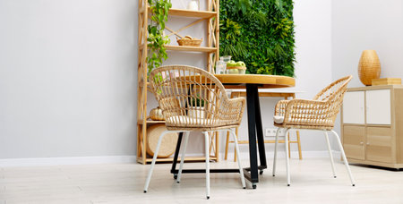 This interior showcases a living space with wooden furniture, including chairs, a sofa, and a table. Plants and natural light enhance the atmosphere. The image suggests a comfortable and inviting setting. Suitable for various applications, this image could be utilized for design, lifestyle, and promotional purposes.