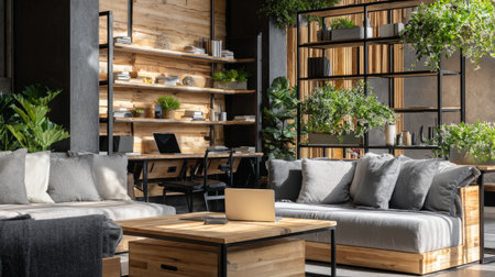 Stylish lounge interior design with cozy sofas, laptop desk, chest drawer, shelving units and fresh greenery decor