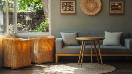 A serene living area showcases a comfortable sofa with cushions a round wooden table and woven chairs bathed in warm sunlight. The space emphasizes natural textures and simplicity.
