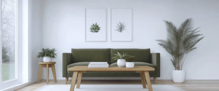 A spacious living room features a green fabric sofa complemented by indoor plants. Two plant artworks adorn the wall enhancing the minimalist decor of the cozy space.