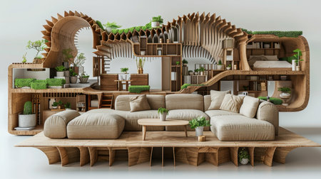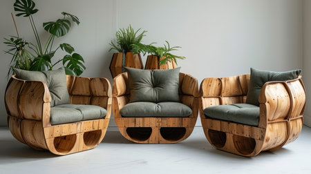 The image showcases a modern, eco-friendly furniture set in a bright space, ideal for advertising home design or editorial content about sustainable living.