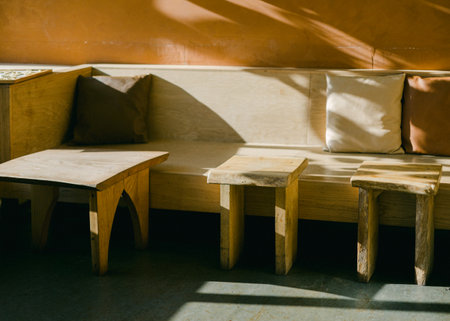 A wooden seating area features a simple design with multiple tables beside a couch adorned with soft pillows. Natural light streams in, creating a warm atmosphere.