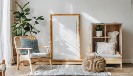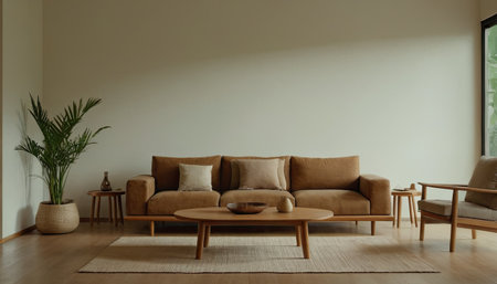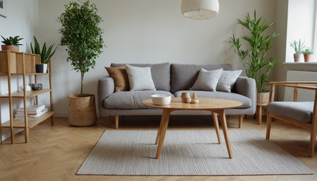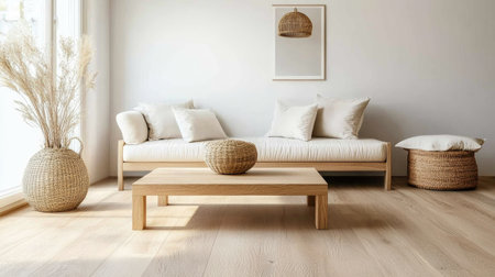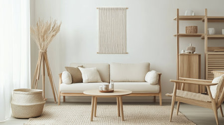 A stylish Scandinavian-inspired living room with light wood furniture, neutral colors, and simple showcasing minimalism and elegance.