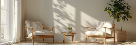 A bright, airy living room with two white armchairs facing each other, positioned in front of a large window with sunlight streaming in. A small table sits between the chairs with a potted plant.
