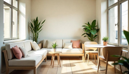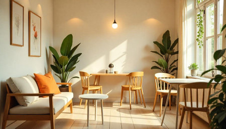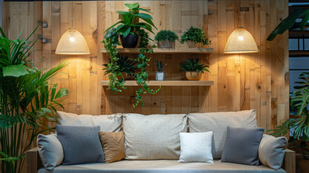 A well-lit interior showcases a living room featuring a sofa, coffee table, and various plants. Soft, warm lighting complements the neutral color palette and wooden elements. The composition suggests a comfortable and inviting atmosphere suitable for lifestyle content and design publications.