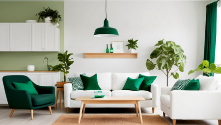 Two comfortable white armchairs with wooden frames are positioned in a modern living room. A green accent wall adds depth while plants and minimalistic decor create a serene atmosphere.