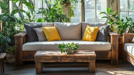 A rustic wooden sofa adorned with yellow and gray cushions sits in a sunlit living room filled with lush plants. The inviting space encourages relaxation and tranquility.
