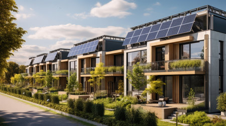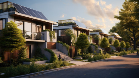 A contemporary eco-friendly residence featuring a sleek, angled roof equipped with solar arrays, warm timber siding, and lush landscaping in a vibrant suburban area.