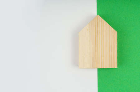 Environmental concept. A wooden house lies on a white-green background.