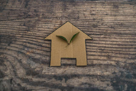green home and energy efficiency conceptual image, ecological house icon with leaves on it on wooden background