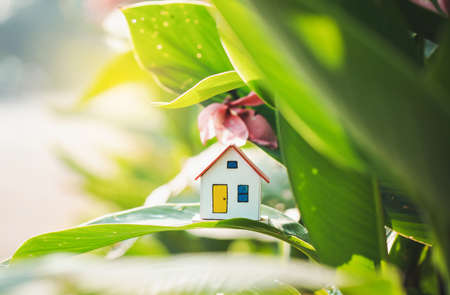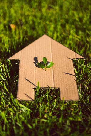 Environmentally eco-friendly real estate house. Small model building property home on grass in green nature ecology. Sustainable energy conservation residential design and sell - rent business concept