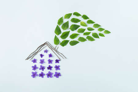 Wooden model of a house isolated on a white background with green leaves, in the rays of the sun. Copy space