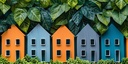 A row of small houses made of cardboard are surrounded by green leaves