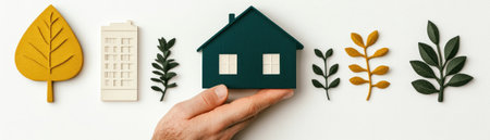 Hand holding a house model surrounded by decorative leaves and a building on a white background.