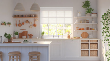 A bright and airy modern kitchen featuring stylish cabinetry, natural light, and indoor plants. The open design creates a tranquil atmosphere perfect for cooking and dining.