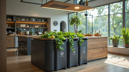 Recycling station with sorting symbols features lush greenery on top, set in a naturally lit modern kitchen with wood accents, creating an eco-conscious and stylish atmosphere ideal for promoting sustainable living.