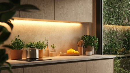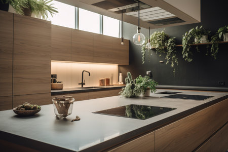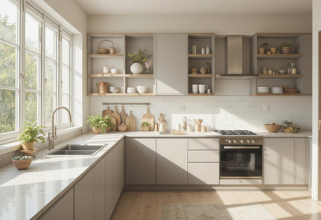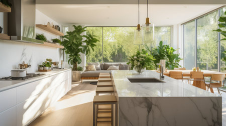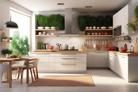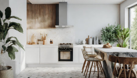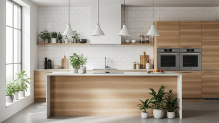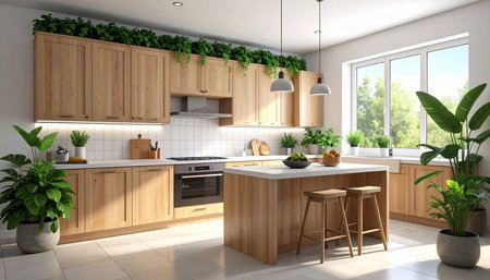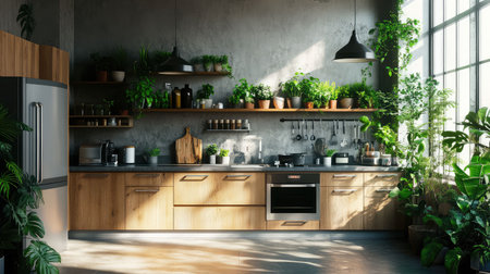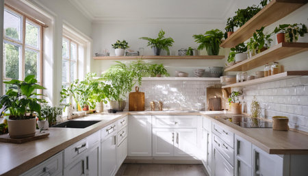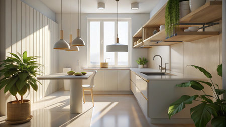 Modern kitchen interior with plants and natural light. Ideal for real estate and contemporary living.