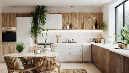 A beautifully designed modern kitchen showcases stylish appliances, natural greenery, and a warm atmosphere, perfect for creating a cozy and inviting living space.