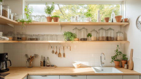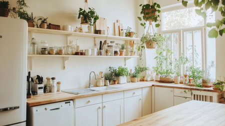 A cozy kitchen filled with lush greenery and sunlight, featuring neatly organized shelves. Ideal for showcasing a calming home environment and modern decor.