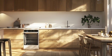 Interior of modern kitchen with built in cooker and wooden cupboards