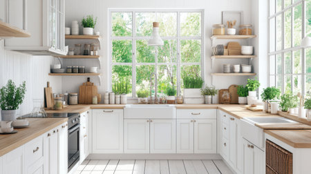 A bright and inviting kitchen featuring modern design, white cabinets, wooden shelves, and abundant natural light, creating a warm atmosphere with greenery visible through the windows.