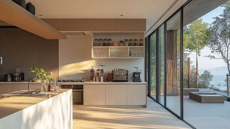 Warm kitchen gathering modern home interior design bright atmosphere wide angle culinary joy