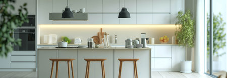 3d Illustration of white modern kitchen in a house with a beautiful design