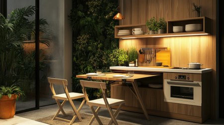 A cozy dining area showcases a foldable wall-mounted table, two wooden chairs, and warm lighting that highlights natural greenery. Perfect for intimate meals.