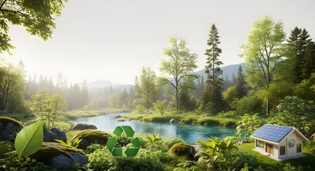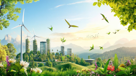 A visual celebration of sustainability efforts, emphasizing net-zero strategies, carbon-negative initiatives, and biodiversity conservation. This image reflects harmony within natures ecosystems