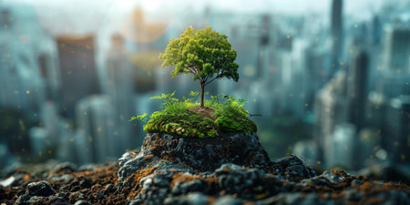 A single green tree stands tall amidst lush field of smaller plants, with blurred urban cityscape background, symbolizing